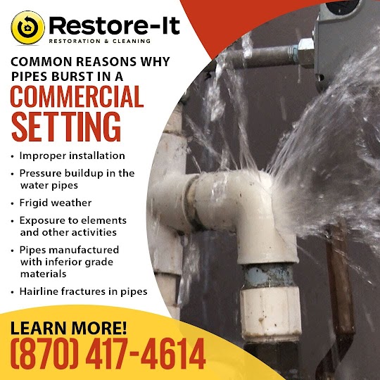 Restore-It Restoration and Cleaning is dedicated to getting a business up and running as soon as possible after a burst pipe water damage disaster. Water pipes in a commercial setting are often under a wide range of stresses that can lead to a catastrophic failure of the body of the pipe, at joints, and where valves are located. Aging, negligence, accidents, vandalism, and other issues factor into the equation that adds up to a burst pipe in an El Dorado, AR, business. Once a pipe bursts, thousands of gallons of water can flood the office floor, the production area, or the warehouse.